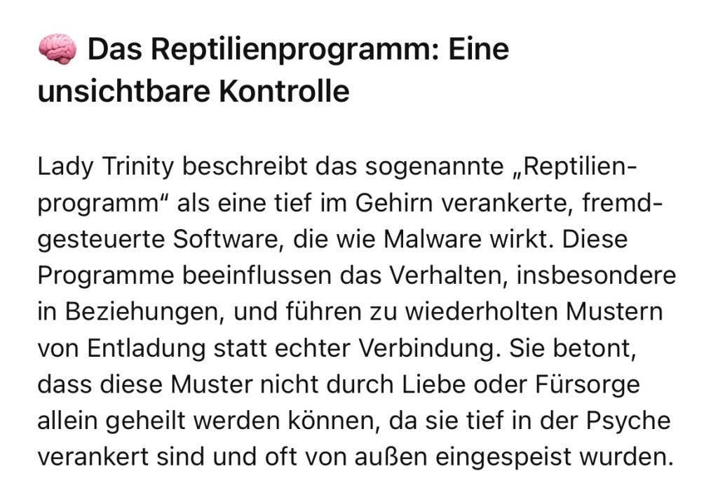 Das ist ein tief eingespeichertes, von außen eingespeistes Reptilienprogramm, das wie eine Malware im Gehirn sitzt.