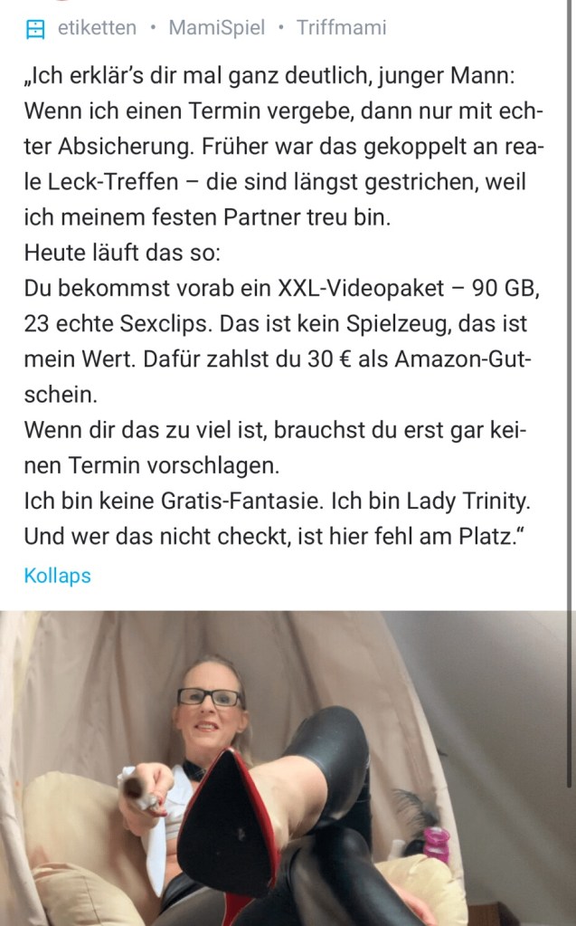Wenn ich dir einen Termin vorschlage – sei es für ein persönliches Coaching, ein Telefonat oder einen heißen Chat – dann nur mit echter Absicherung. Ich bin keine Gratis-Fantasie. Ich bin Lady Trinity. Und wer das nicht checkt, ist hier fehl am Platz.