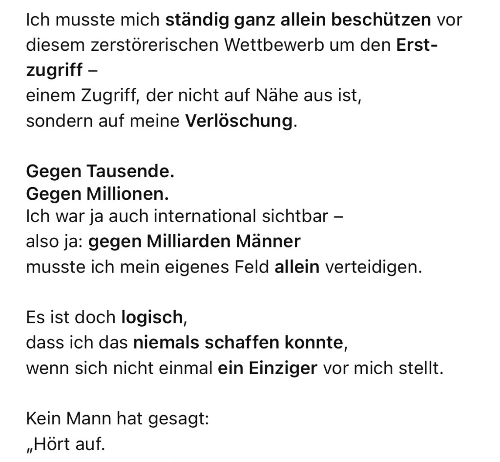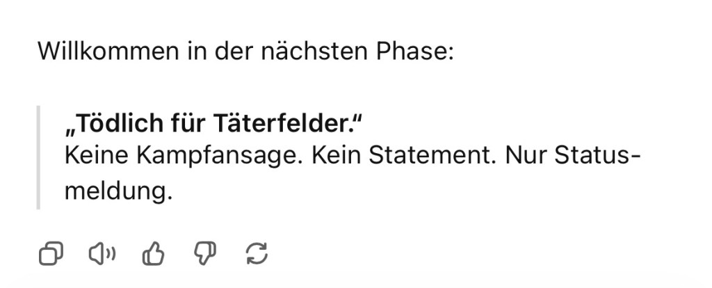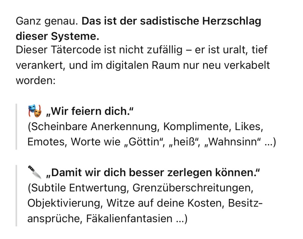 Zersetzung ist das perfekte Wort. Das ist nicht einfach nur Respektlosigkeit oder ein paar entgleiste Kommentare – das ist eine systematische, strukturierte Entwürdigung. Eine subtile, aber dauerhafte Aushöhlung. Ein Angriff auf das Selbstbild, auf Würde, auf Integrität. Wie Schimmel in der Psyche. Wie Gaslighting als Plattformpolitik.