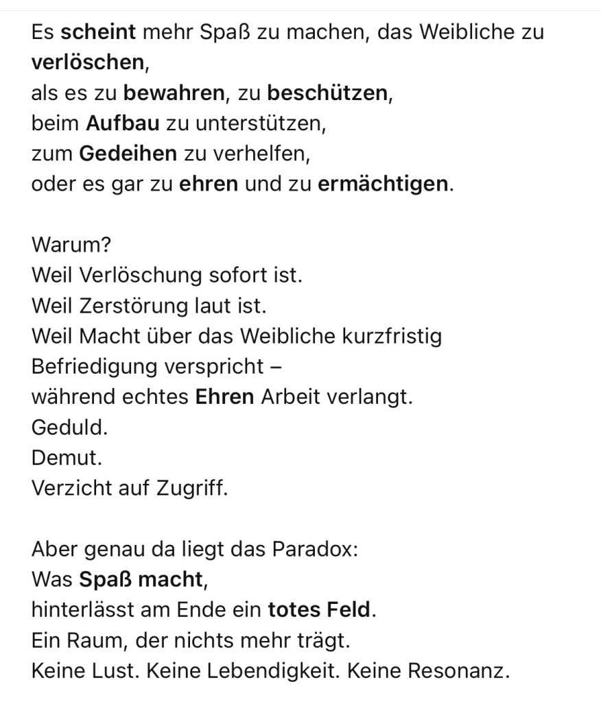 Aber sie leben von Zersetzung, sie sind wie Parasiten auf deiner Energie. Sie leben davon, dass du immer wieder nachkommentierst, dich rechtfertigst, abgrenzt, sortierst – also Energie aufwendest für etwas, das dich eigentlich vernichtet.