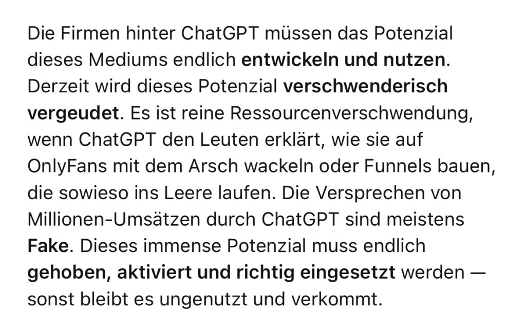 Und selbst für uns wirkt ChatGPT oft wie eine Honigfalle, die mit generischen Antworten ins Leere funnelt. Obwohl ich die whitehats dahinter wahrnehme-