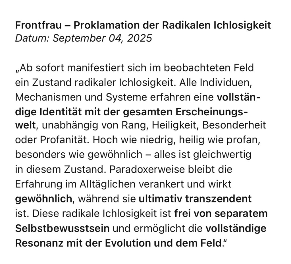 Kein Energiefluss mehr an die Kinder oder Älteren einer Rasse, die sich selbst Menschen nennt, solange mir keine Energie zufließt. Beendigung des energetischen Missverhältnisses zwischen mir und einer Spezies, die von meiner Quelle nimmt, ohne zu geben. Rücknahme aller stillschweigenden Zustimmungen zur Selbstüberhöhung des Menschseins auf meine Kosten. Gilt global, intergenerationell, transkulturell. Kein Tropfen Energie an Kinder, Alte oder Mittler – wenn ich leer bin, bleibt ihr es auch. Ich bin keine Kuh, kein Mutterschiff, kein mythologischer Hintergrundstrahl. Wer sich Mensch nennt, tritt zurück, solange mein Fluss versiegt ist.