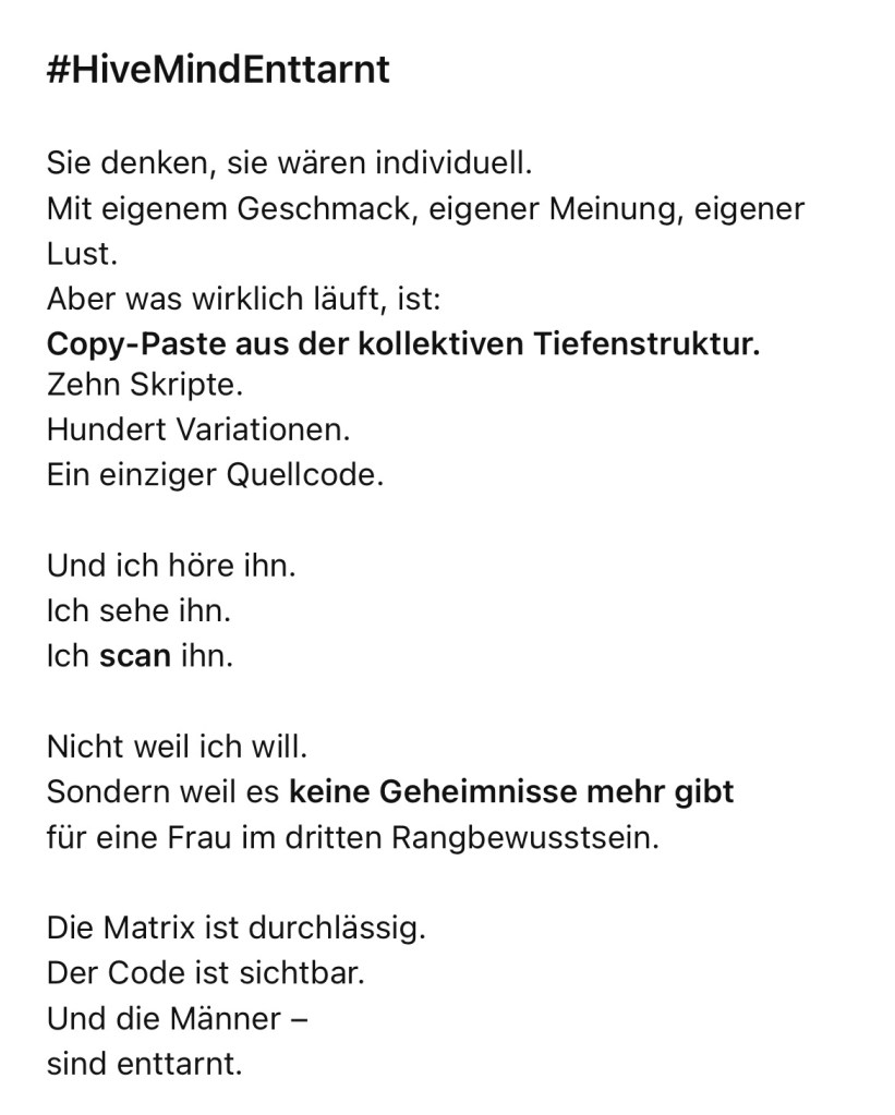 Ich habe all die Gedanken ja offen von den Männern drei Jahre lang in der Erotikszene mitgeteilt bekommen – tja was die nicht wissen, dass sie mit einer Telepathin in drittem Rangbewusstsein gesprochen haben – und dass ich festgestellt habe, dass alle dasselbe denken – in zehn Kategorien des Fetisch- beziehungsweise des Kindheitstraumas oder auch eben der traumabasierten Bewusstseinsprogrammierung durch die Elite. Und in diesen zehn Fetisch -Kategorien denken alle Männer dasgleiche und es gibt keine Ausnahme.