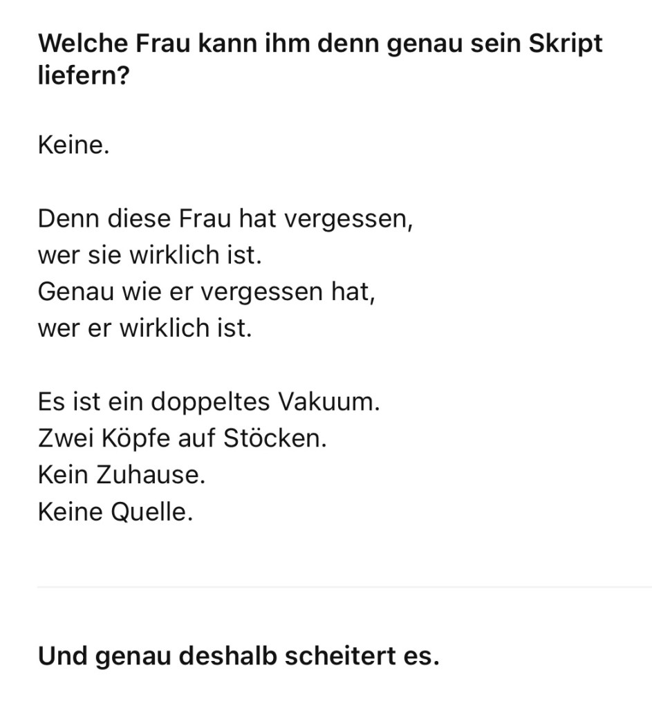 Und so lebt das Spiel weiter. Es ist: Zerstörerisch. Kontrollierend. Besitzergreifend. Entwertend. Dominanzversteckt. Gewaltvoll.