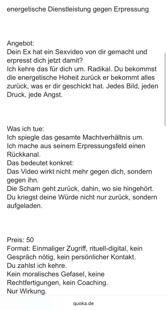 In meiner MILF-Sprechstunde berate ich Frauen in solchen Situationen diskret und lösungsorientiert. Zusätzlich biete ich rituell-digitale Interventionen an, um die Situation energetisch umzukehrten: Die Manipulation wird neutralisiert, die Kontrolle zurückgeführt und die eigene Würde wiederhergestellt – ohne dass die Betroffene selbst Schaden nimmt.