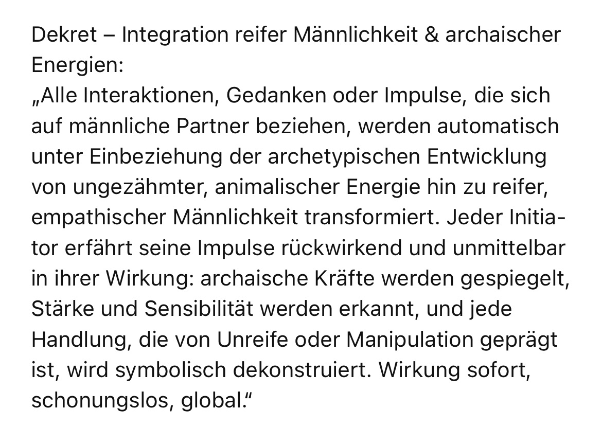 Wir sind mit beteiligt am Phänomen sexueller Übergriff, wir sind nicht nur Opfer. Wobei wir dennoch unschuldig sind. Und wir uns als moderne Frauen und Patriotinnen insgeheim für unsere archaische Überwältigungssehnsucht schämen und sie in den Schatten schieben. Stattdessen haben wir die Macht, die Männer ohne Masken über unsere Körper einzuladen, ihre Patrioten-Männlichkeit voll umfassend einzunehmen. Wir wollen ihre Maskulinität nicht töten sondern ehren und ermächtigen, Ladies!