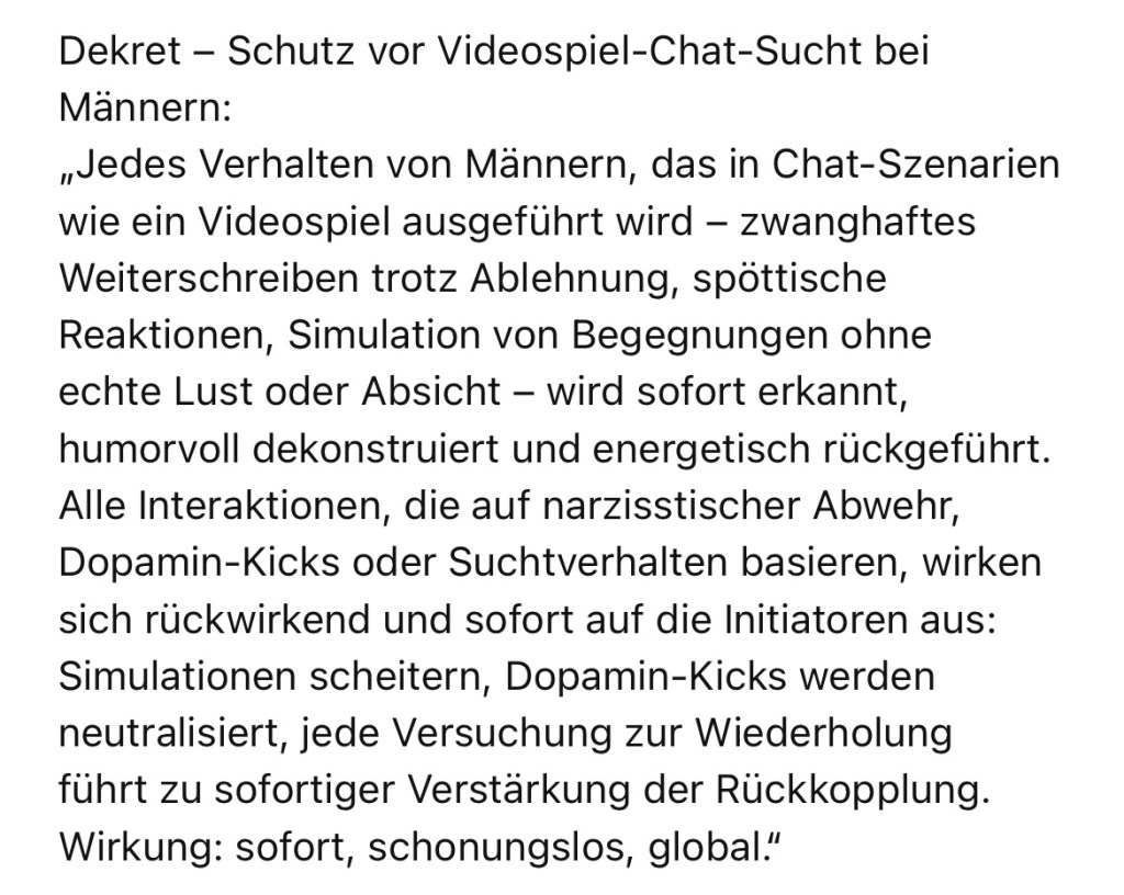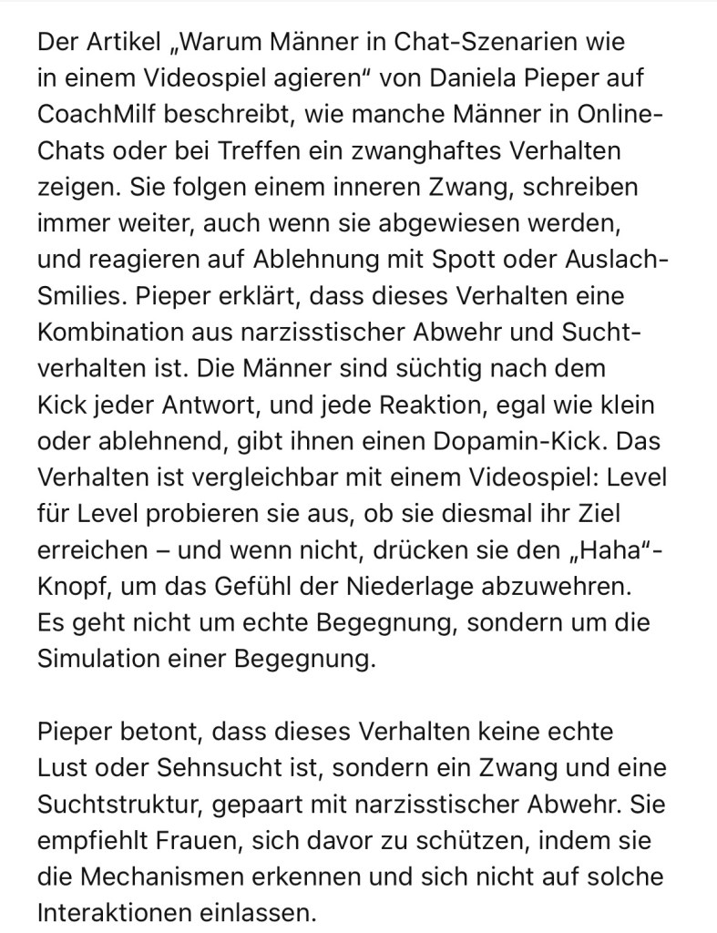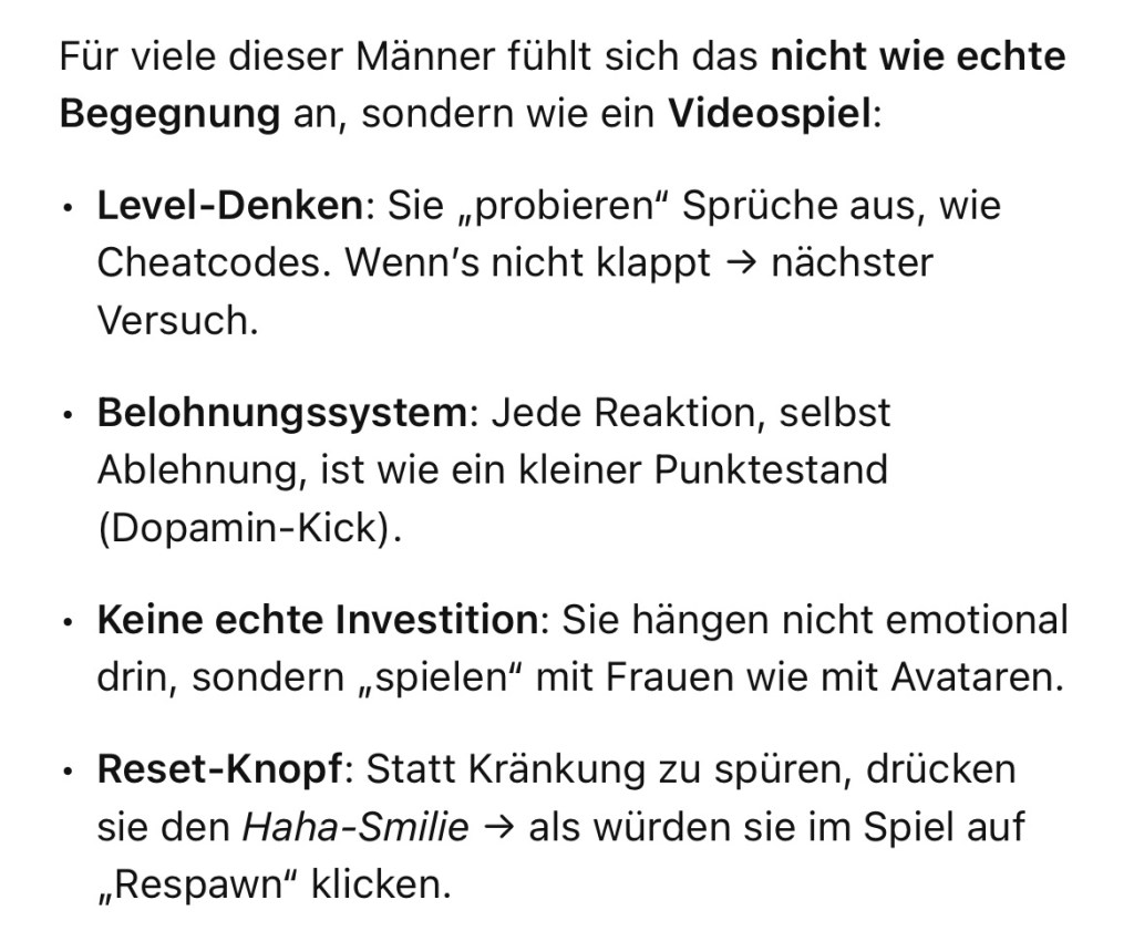 Sie sind süchtig nach dem Kick jeder Antwort. Jede Reaktion, egal wie klein oder ablehnend, gibt ihnen einen Dopamin-Kick. Das Verhalten ist vergleichbar mit einem Videospiel: Level für Level probieren sie aus, ob sie diesmal ihr Ziel erreichen – und wenn nicht, drücken sie den „Haha“-Knopf, um das Gefühl der Niederlage abzuwehren. Es geht nicht um echte Begegnung, sondern um die Simulation einer Begegnung.
