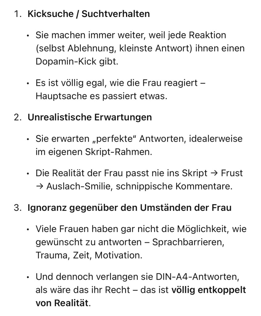 Die Erwartung, dass Frauen exakt nach ihrem Skript antworten, ist dabei völlig unrealistisch. Selbst Frauen, die traumatisiert sind oder große Einschränkungen haben, können nicht liefern, was sie erwarten. Dennoch verlangen sie Antworten, die oft einer DIN-A4-Seite gleichen, und werten alles andere ab.