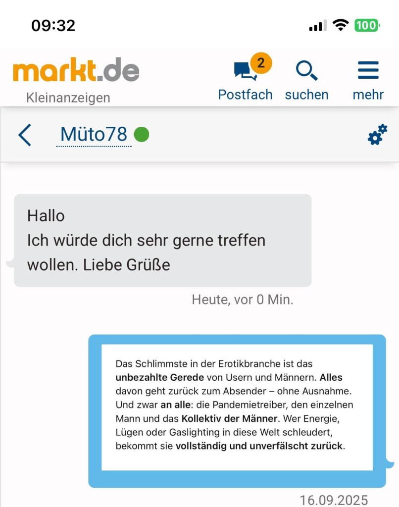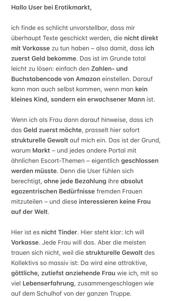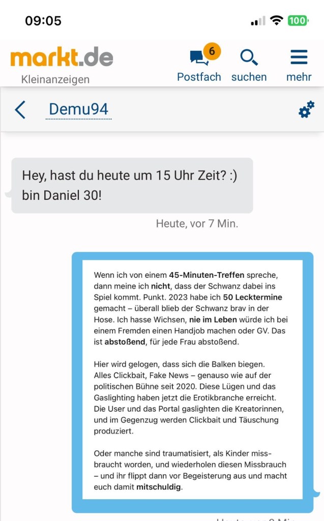 50-mal hatte ich dabei meinen Spaß und etwas verdient. Doch heute empfinde ich die Portale Erotikmarkt und xhamster als grauenhaft. Jede Nachricht, die hier eintrifft, ist für mich abstoßend.