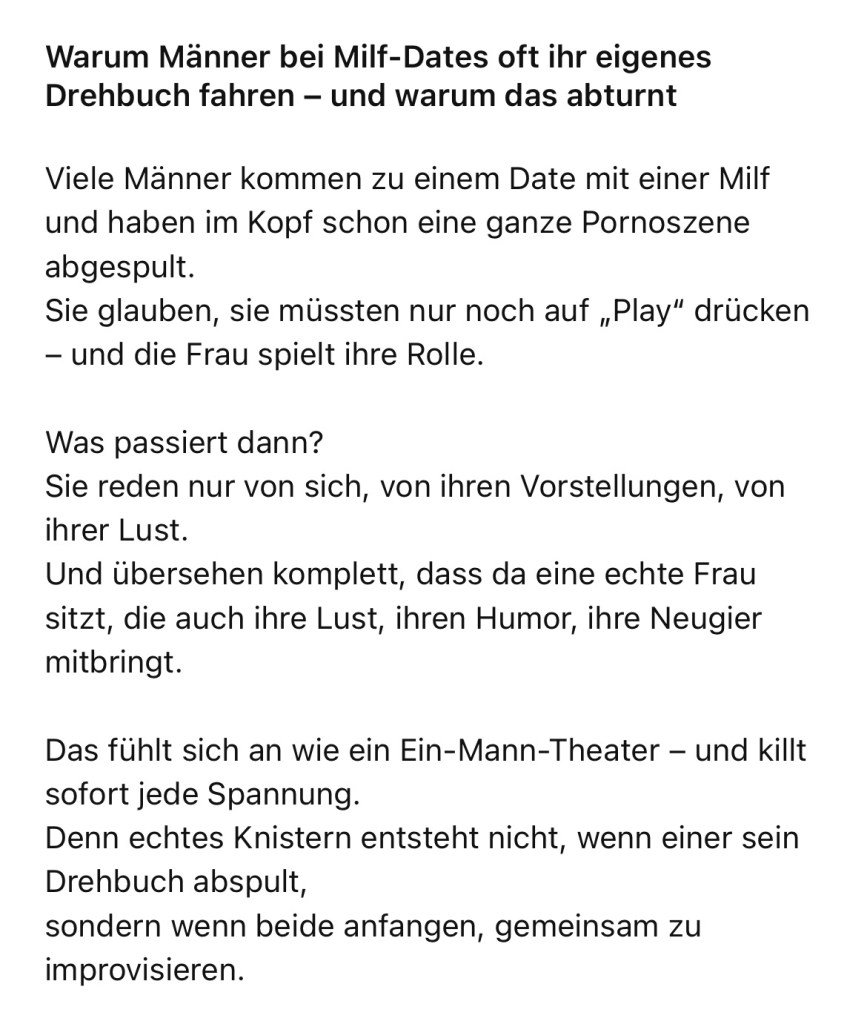 „Warum Männer bei Milf-Dates oft ihr eigenes Drehbuch fahren – und warum das so abturnt“