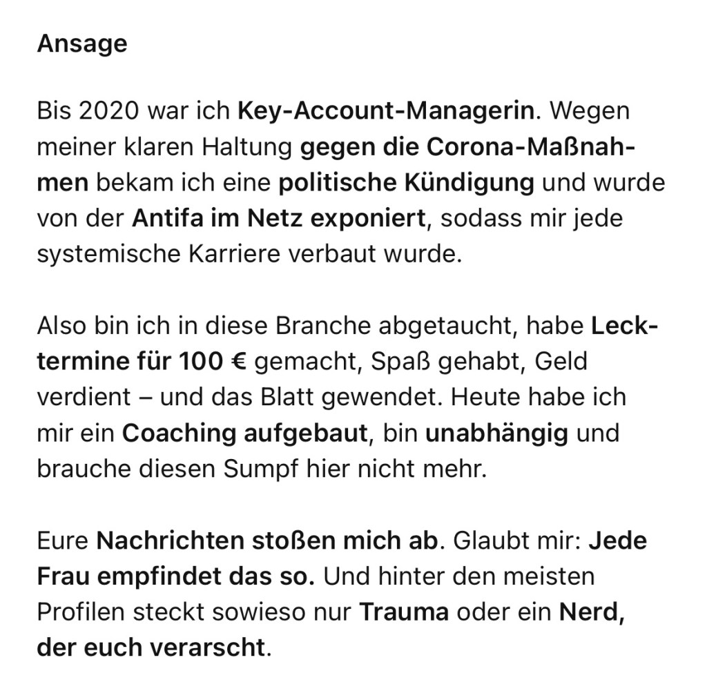 Eure Nachrichten hier empfinde ich nur noch als Zumutung. Und ich bin überzeugt, jede Frau fühlt tief drinnen genauso. Hinter den Profilen, die ihr hier treffen wollt, steckt oft nur eine traumatisierte Frau mit Kindheitstrauma – oder ein dicker Nerd, der euch verarscht.