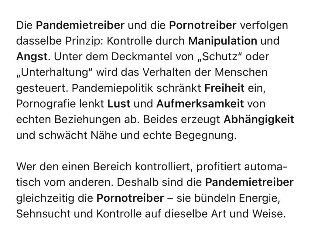 Ich brauche das Geld nicht mehr. Inzwischen habe ich mir ein anti -Porno Coaching aufgebaut, mit dem ich unabhängig bin. Denn ich lehne Porno so wie die Massnahmen radikal ab. Die Pandemie-Treiber sind die Pornotreiber!