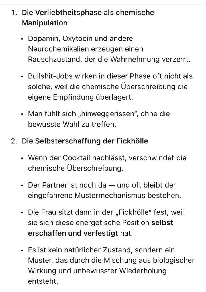 In der Phase von Verliebtheit oder Rausch wird das ursprüngliche Empfinden, das Bullshit-Jobs wie blowjob identifiziert, temporär überschrieben durch einen hormonellen Cocktail — Dopamin, Oxytocin, Serotonin usw.