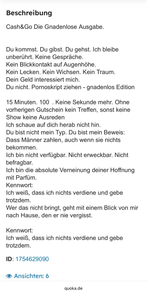Mein Format ist keine Therapie, kein Coaching und keine Heilpraxis – sondern ein scharfer, individueller Analysezugriff mit Fokus auf Selbstermächtigung und mentale Entkopplung. Zielgruppe: Menschen, die Selbstverantwortung ernst meinen – und keine Wiederholungsschleifen mehr dulden. Methodik: Einzelberatung per Fernwartung, Telegram oder Signal. Diskret, fokussiert, mit technischer Klarheit.