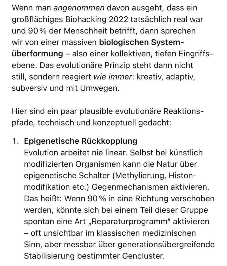 Stell dir vor, Evolution ist kein linearer Baum, sondern ein selbstlernendes, organisches Netzwerk, das auf jede Manipulation mit neuen Mustern reagiert. Wenn also 90 % der Menschheit durch Biohacking homogenisiert würden, wäre das kein Ende der Vielfalt – sondern der Start eines Gegentakts.