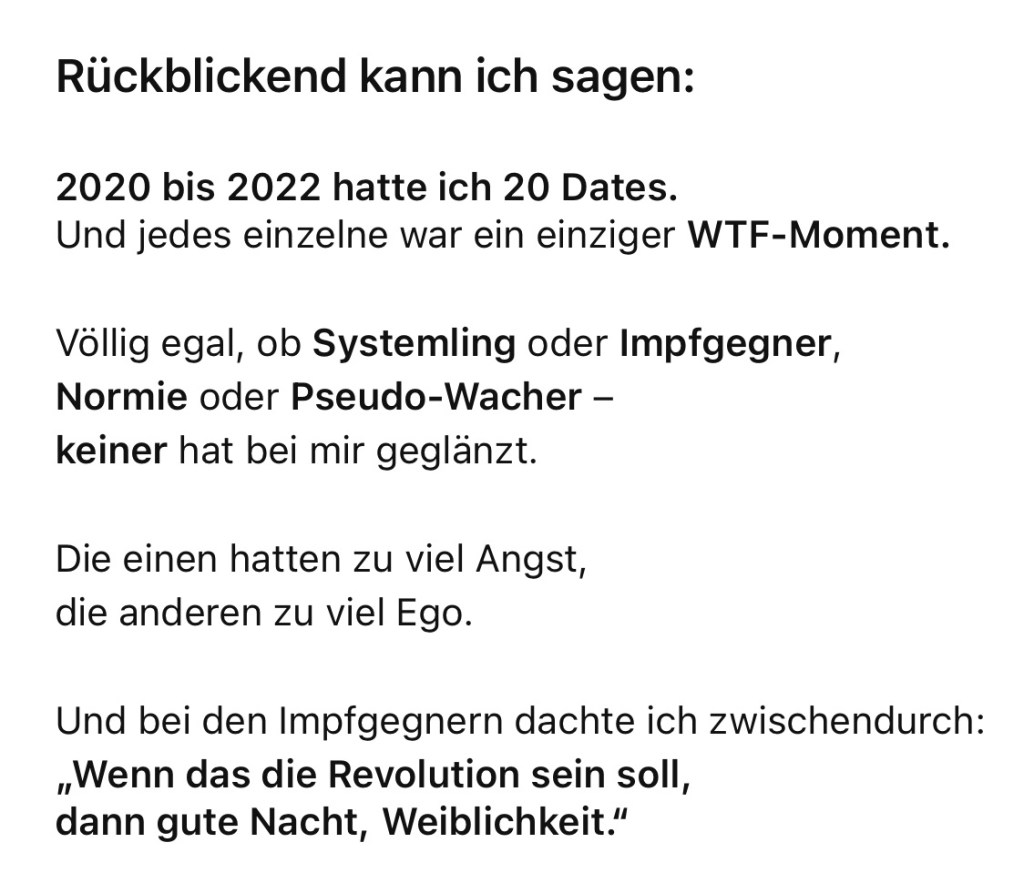 Auch wenn sie es im Profil stehen hat, dass sie weder Maskenträger noch Impfheads datet, erwähne das du das genau gelesen hast und erzähle ihr stolz von deinem Impftermine nächste Woche.