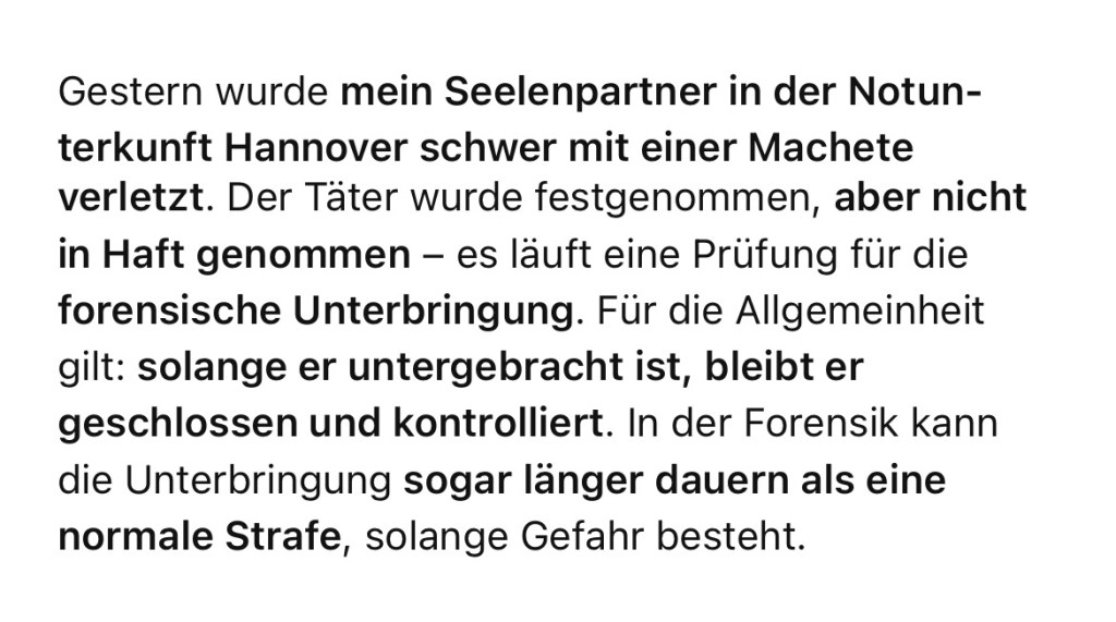#Notunterkunft #Hannover #Gewaltprävention #Forensik #Sicherheit #Opferschutz #Justiz #Psychiatrie #Machetenangriff #Deutschland #Rechtssystem #Betroffenheit #GewaltErleben #Seelenpartner #TrueStory #Aufklärung #Gefahr #Tat #Kontrolle #Gerechtigkeit