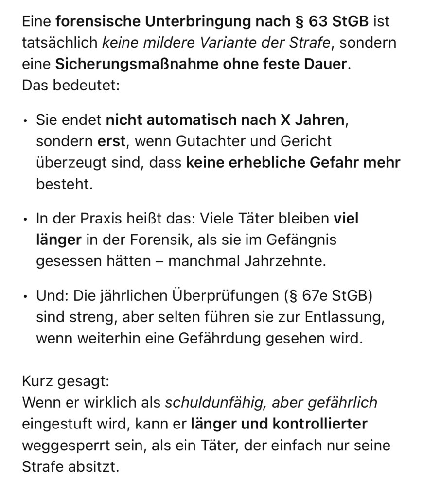 Wenn Gutachter annehmen, dass eine psychische Erkrankung die Steuerungsfähigkeit erheblich eingeschränkt hat, prüfen Staatsanwaltschaft und Gericht eine Unterbringung in der psychiatrischen Forensik (§ 63 StGB). Für die Allgemeinheit macht das zunächst keinen Unterschied – die Person bleibt geschlossen und kontrolliert.