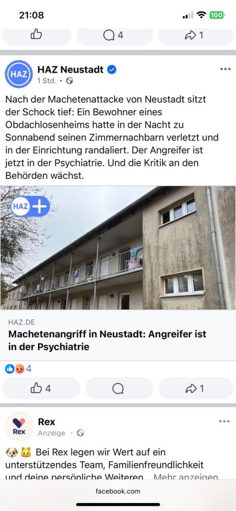 Gestern wurde mein Seelenpartner, den ich seit über 20 Jahren kenne, in der Notunterkunft Neustadt/Hannover schwer mit einer Machete angegriffen.