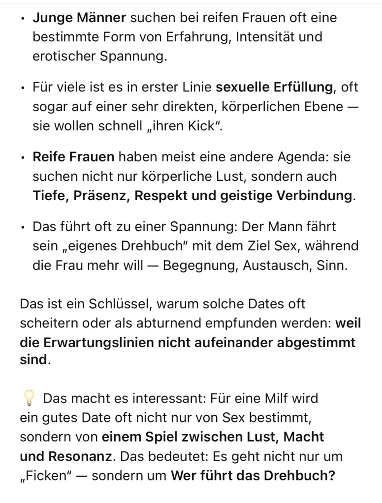 - Warum Männer bei Milf-Dates oft ihr eigenes Drehbuch fahren — und warum das so abturnt💡 Milf-Dates: Warum es oft schiefgeht Junge Männer kommen mit einem Drehbuch: Sex. Punkt. Reife Frauen kommen mit Präsenz, Tiefe und Grenzen. Das Ergebnis? Clash der Erwartungen — und Lust, die stirbt. Wer das Drehbuch schreibt, entscheidet über das Date. 🔥