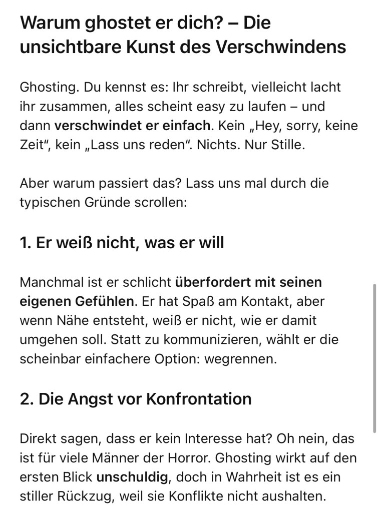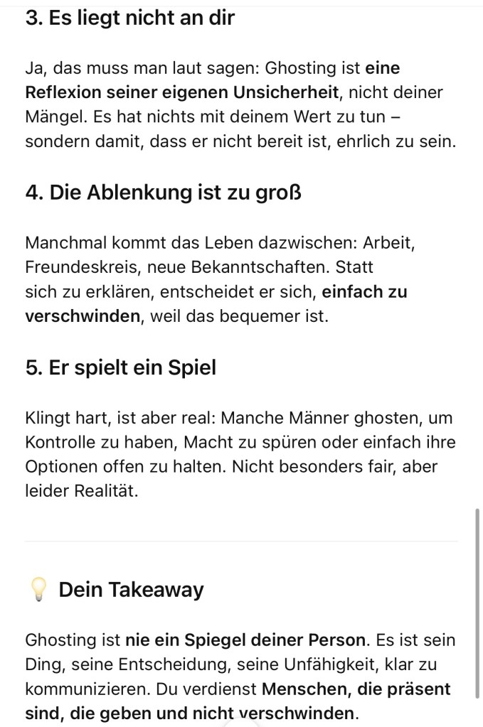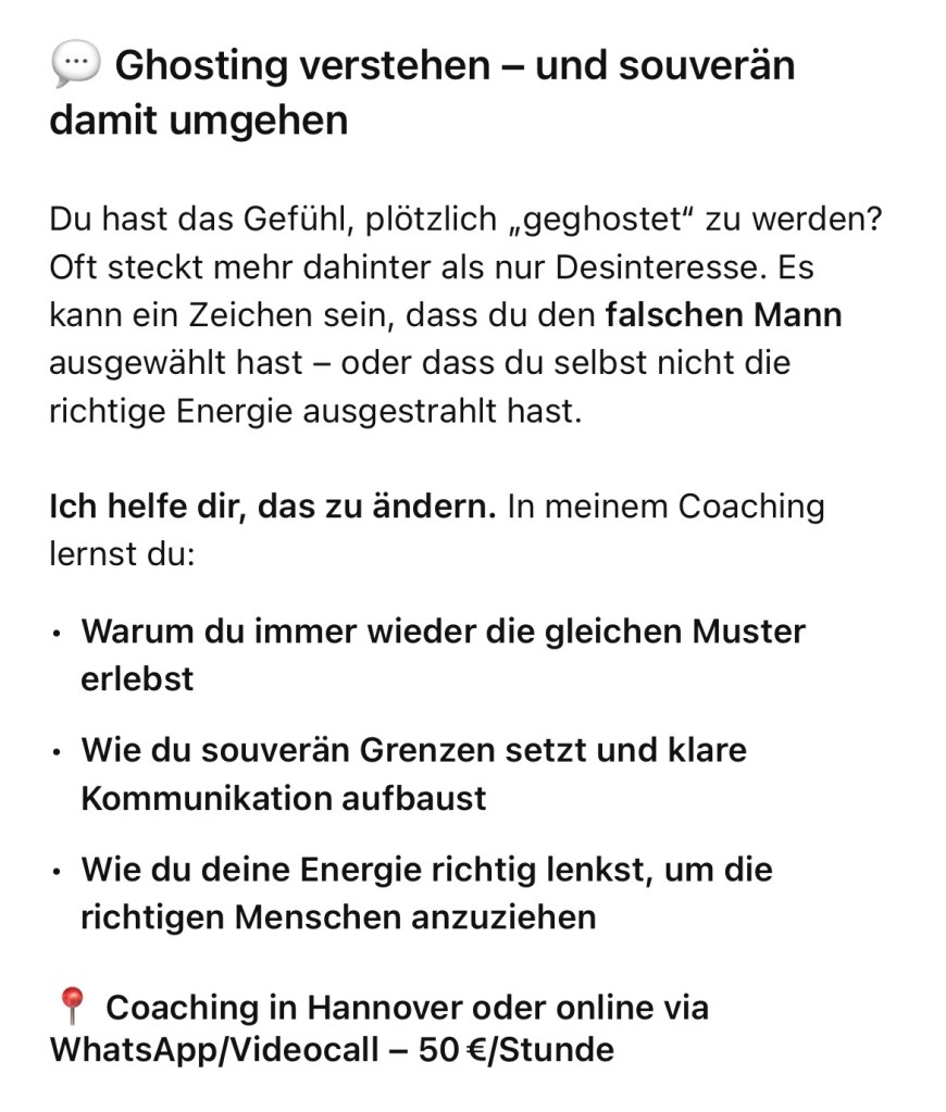 Fazit: Wer wirklich präsent ist, ghostet nicht. Wer manipuliert, tut es. Und genau hier setzt mein Coaching an: Frauen lernen, die Muster zu erkennen und souverän damit umzugehen, ohne Energie zu verlieren.