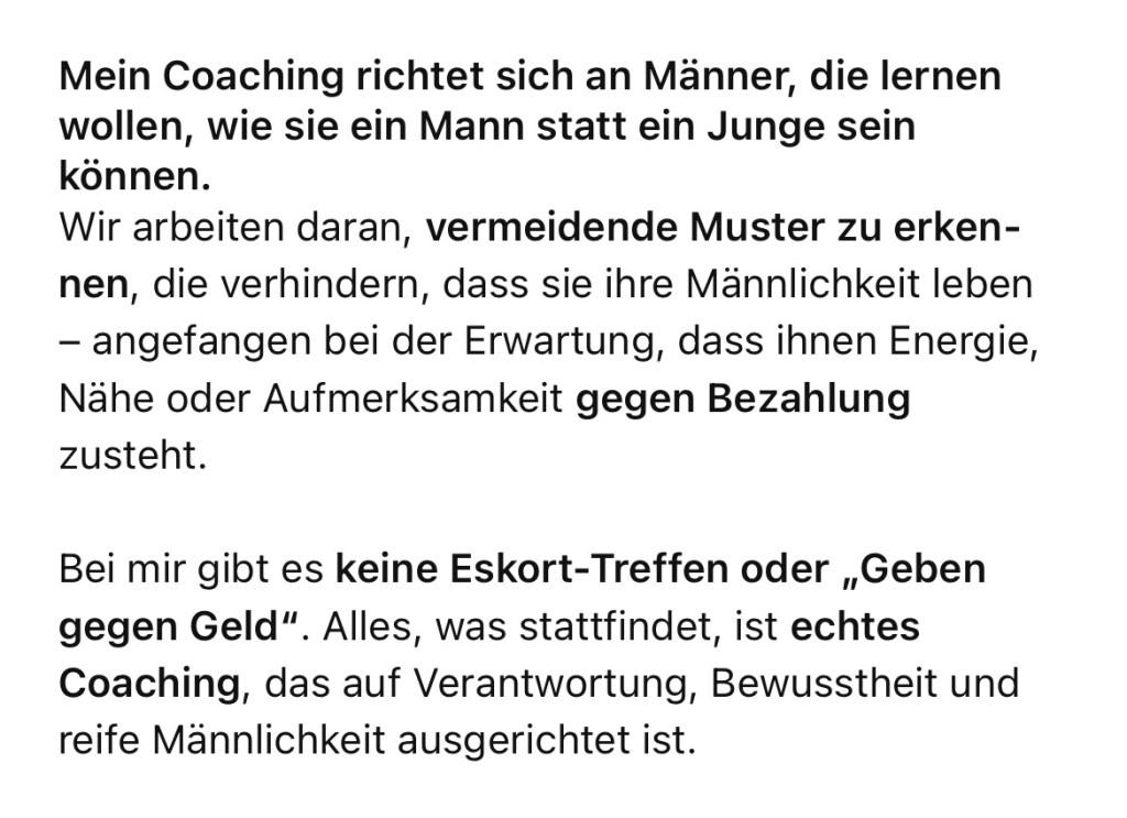 „Viele NoFap-Coaches reden nur über ‘nicht wichsen’. Ich arbeite mit dir auf der mentalen Ebene: Gedanken, Fantasien, Trigger. Alles, was dich zurückhält, lösen wir auf – ohne Fetisch, ohne Keuschhaltung. Nur Klarheit und Kontrolle im Kopf.“