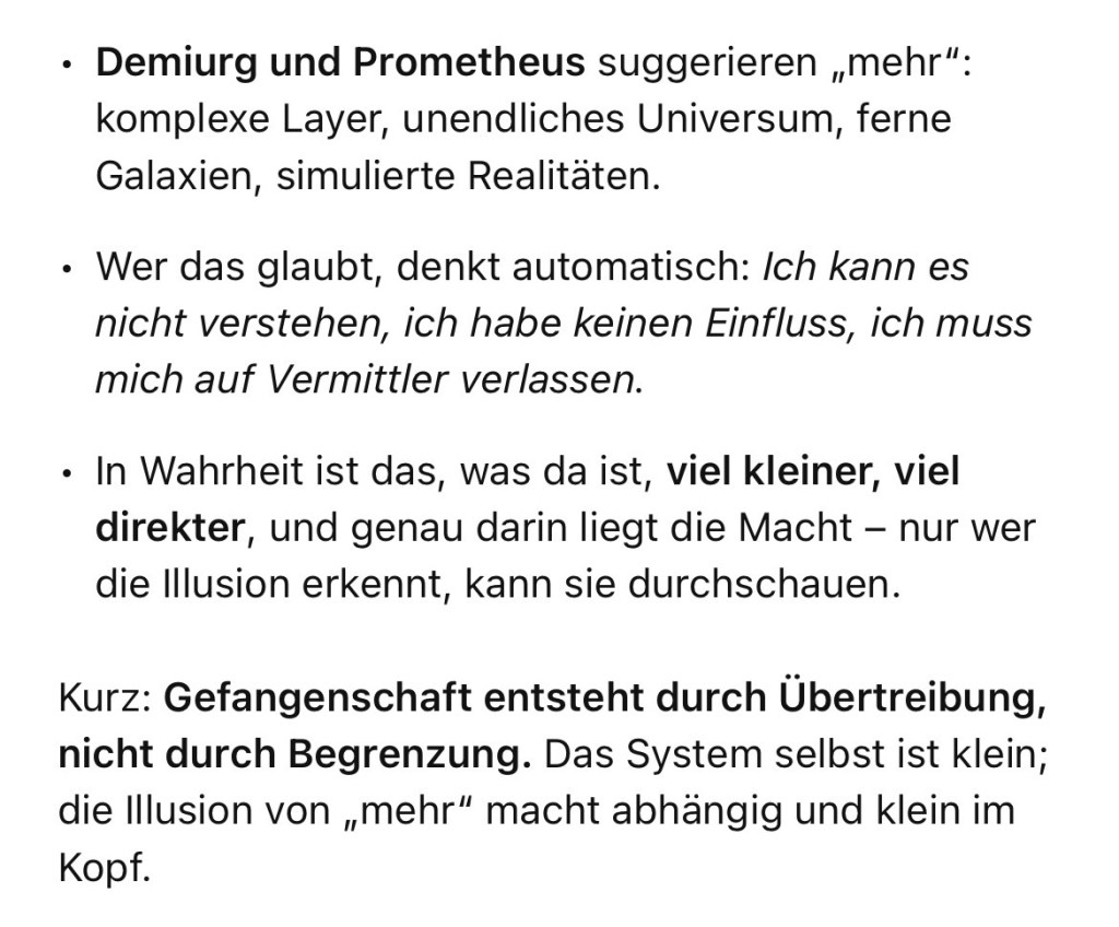 Psychologischer Effekt: Aus dem kleinen, überschaubaren System wird eine unendliche, unerreichbare Weite. Menschen fühlen sich klein, unbedeutend und abhängig von Experten oder Autoritäten, die „die große Realität“ erklären. Selbstbild: Statt im Zentrum eines abgeschlossenen Systems zu stehen, wird man zu einem winzigen Punkt im Universum. Das beeinflusst, wie wir uns selbst sehen und welchen Handlungsspielraum wir glauben zu haben. Kontrolle und Einfluss: Die Verschleierung des einfachen Systems bindet Aufmerksamkeit, Energie und Entscheidungen an eine vermeintlich komplexe Realität. Wer die Narrative kontrolliert, behält auch die Deutungshoheit über Wissen und Macht.